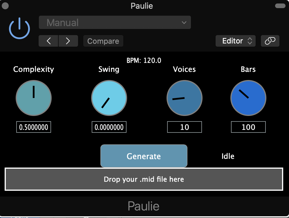 User can apply complexity (to choose how complicated the polyrhythm's are) Swing (for added swing), Voices (For how many individual drum sounds you want it to generate, and Bars (for how many bars you want it to make.)